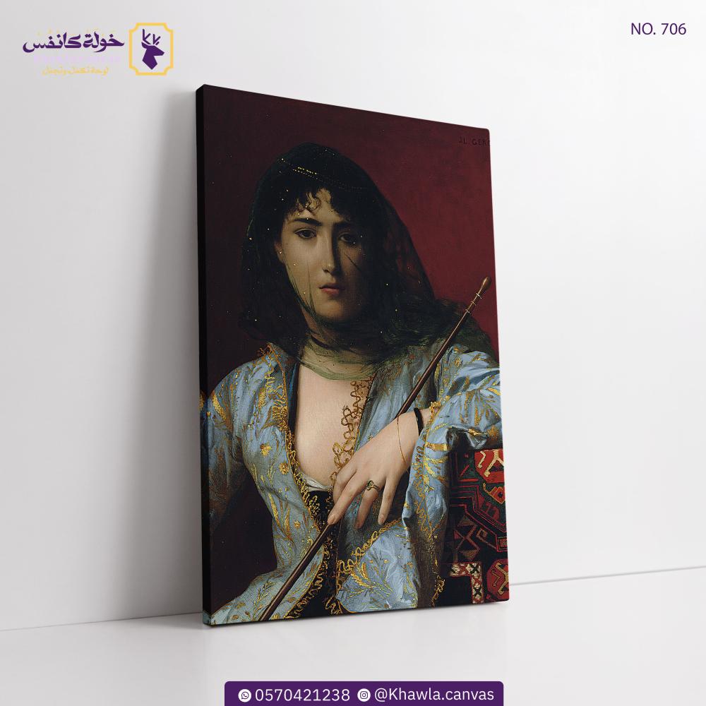 يعكس الفنان جيروم جمال المرأة الشرقية بعيون غامضة ونظرة متزنة، مع تفاصيل دقيقة في لباسها المطرز وحجابها الرقيق. الخلفية محايدة نسبيًا، تُبرز الشخصية وتعزز من حضورها.