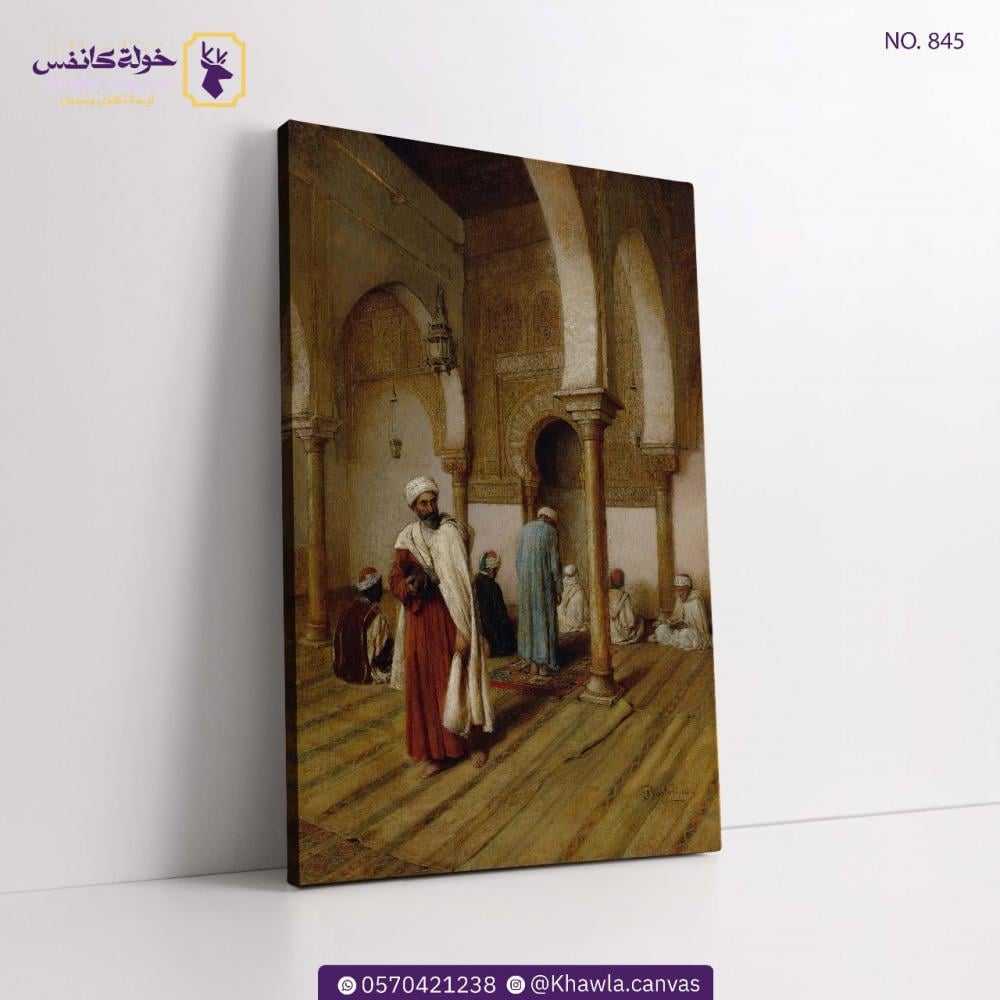 تجسد اللوحة لحظة خشوع داخل مسجد تونسي، حيث يظهر عدد من المصلين في لحظة سجود وسط معمار إسلامي فخم مزخرف بالأقواس والفسيفساء. يتلاعب الضوء الداخل من النوافذ العالية مع الظلال بشكل درامي يضفي على المشهد هدوءًا وروحانية. التكوين متوازن، وتوزيع الشخصيات يعكس الترتيب الصفّي للصلاة.