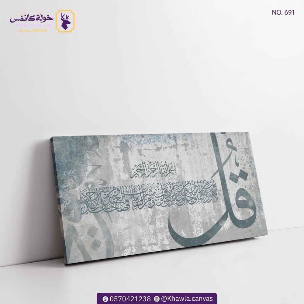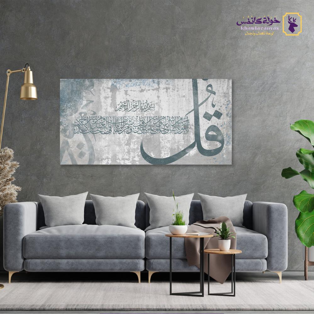 A Quranic manuscript of Surat Al-Falaq (( Say, “I seek refuge in the Lord of daybreak (1) From the evil of that which He created (2) And from the evil of darkness when it settles (3) And from the evil of those who blow on knots (4) And from the evil of an envier when he envies (5)))) by the most skilled calligraphers in a luxurious design in gray, printed on the finest canvas and stretched on a wooden frame, ready to hang.