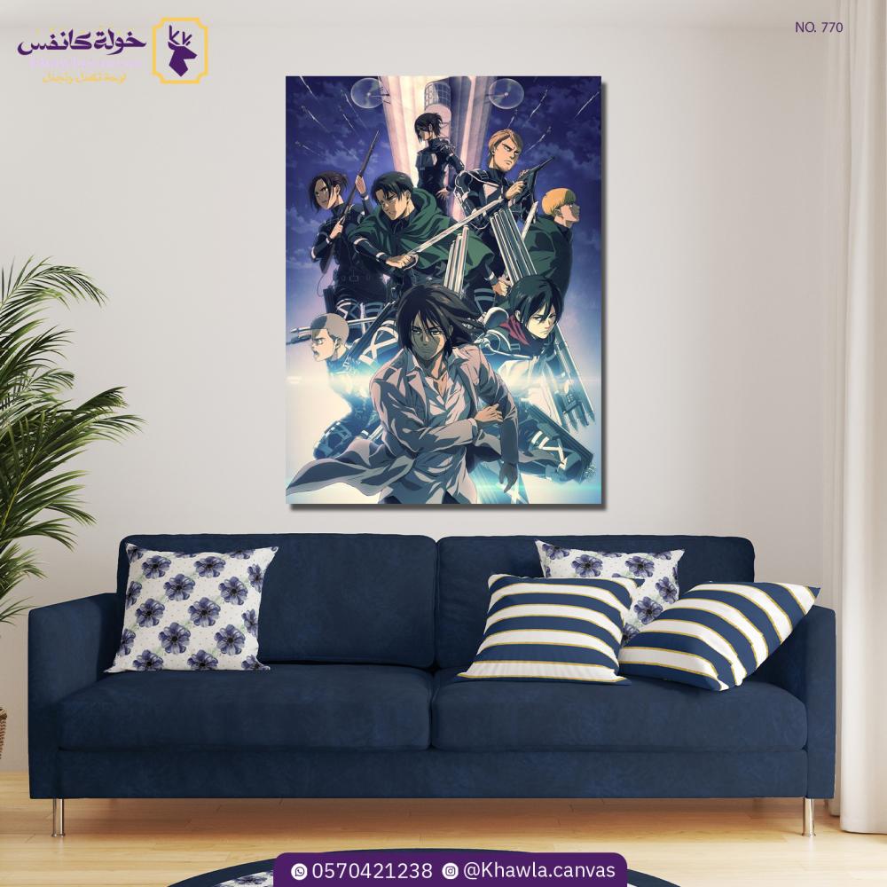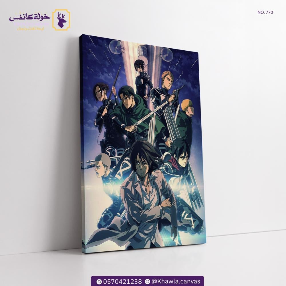 An elegant artwork featuring the Attack on Titan anime's heroes in a legendary scene brimming with power and excitement. The details of the drawing, shadows, and background colors reflect the fighting spirit and determination that characterize the characters. This high-quality canvas print from Khawla Canvas makes it an ideal piece for anime fans, adding a different energy and a modern touch to your bedroom or office wall.
