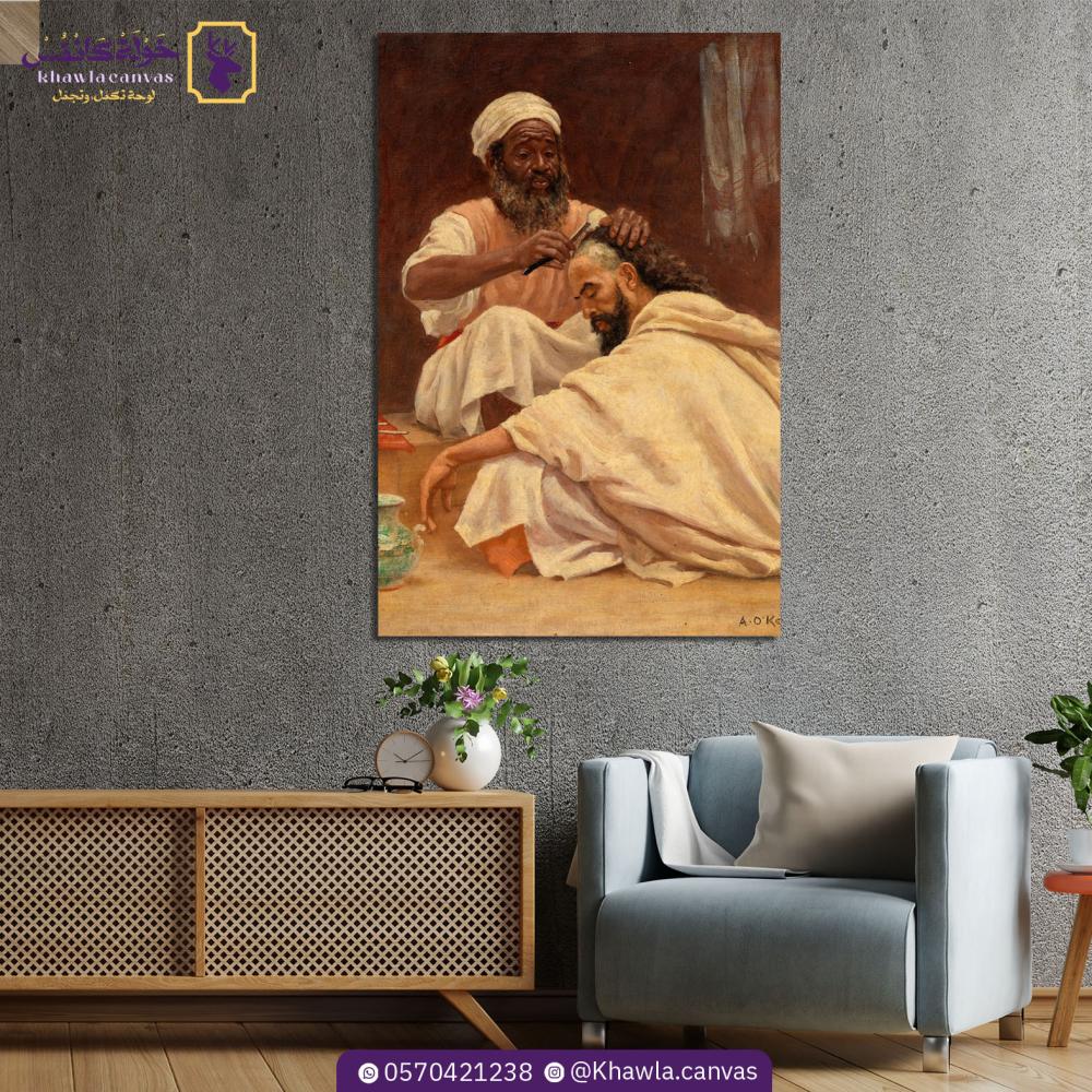 A painting depicting a realistic everyday scene of a man sitting on the ground while a barber shaves his head amidst a traditional Moroccan setting. Surrounded by a clay wall and simple tools, they reflect the simplicity and intricate details of daily life.