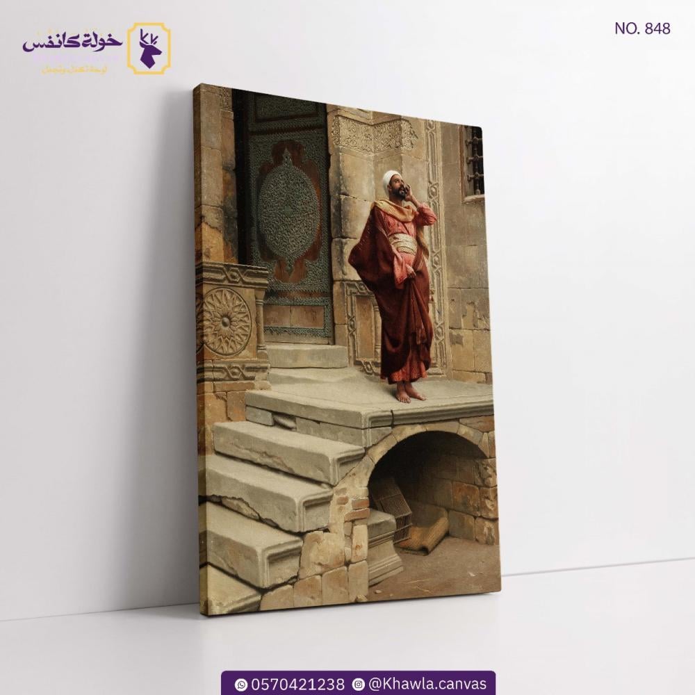 In this stunning painting, the artist depicts a muezzin standing at the top of a mosque minaret, calling the prayer, in a scene brimming with serenity and spirituality. The painting reflects a symbolic moment in the lives of Islamic societies, highlighting the lavish oriental architecture through its rich decorations and delicately carved stone domes.