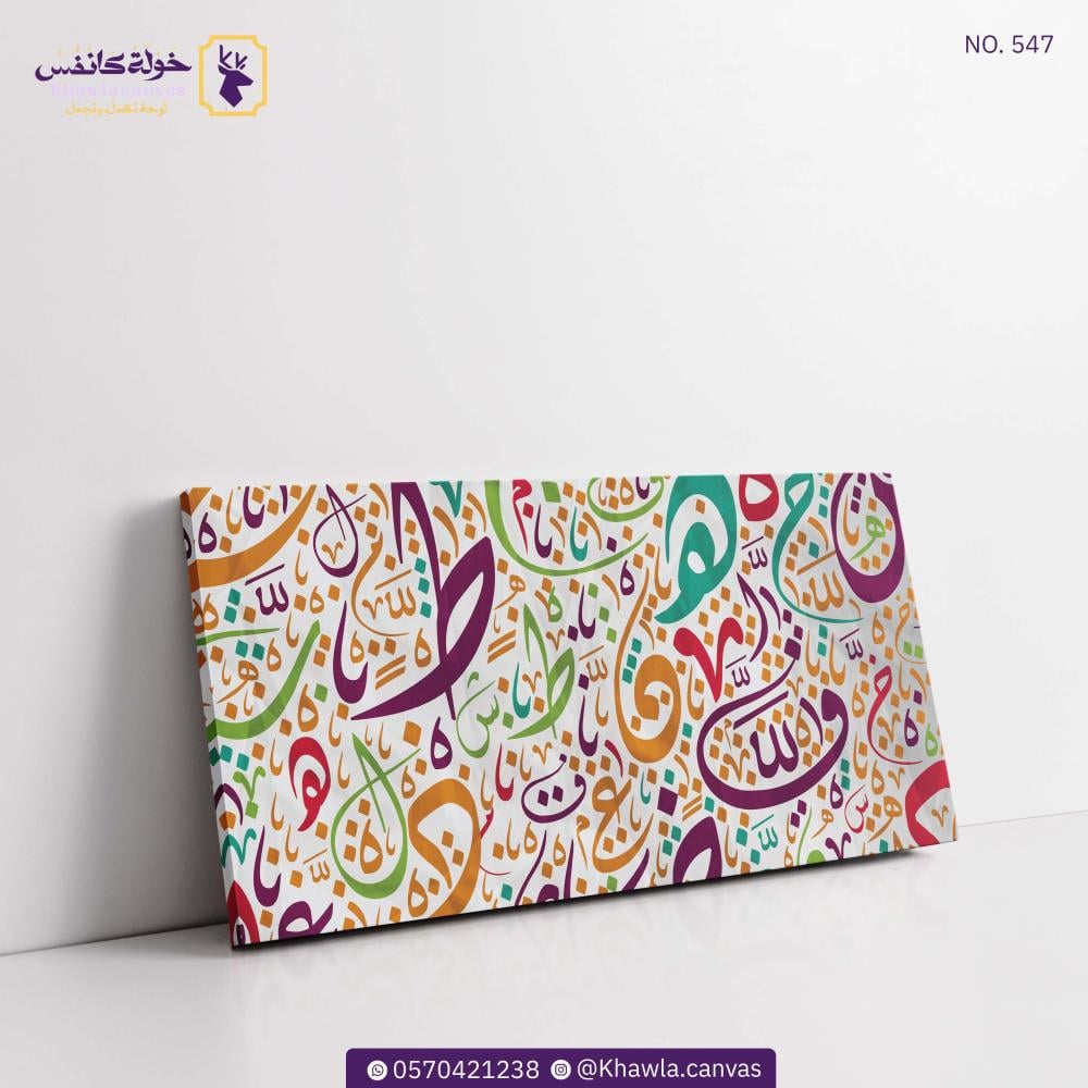 A painting of a manuscript of Arabic letters in multiple colors, printed using the latest high-resolution Japanese machines (Roland) on canvas and stretched on a wooden frame.