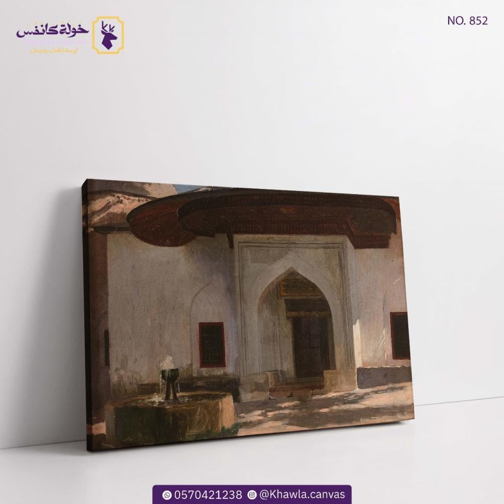 The painting depicts a refined architectural scene showing the entrance to an oriental monument—most likely a mosque or mausoleum in Egypt. A decorative fountain stands in the center of the painting, its water reflecting the sky and surrounding sculptures. The rich details of Islamic architecture are prominent: arches, geometric motifs, and decorative stones.