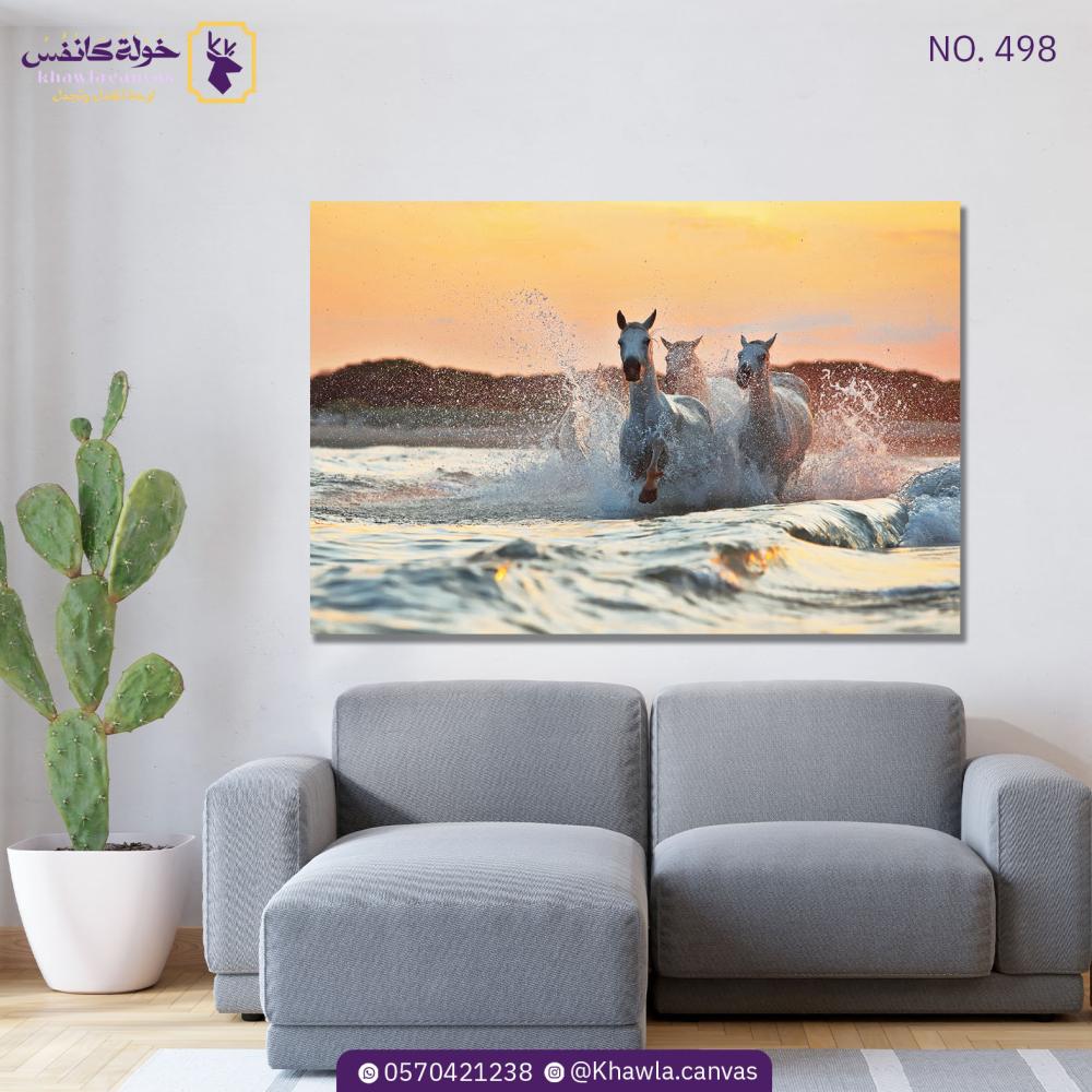A painting of white horses running on the beach printed on the finest canvas and stretched over a hidden wooden frame.