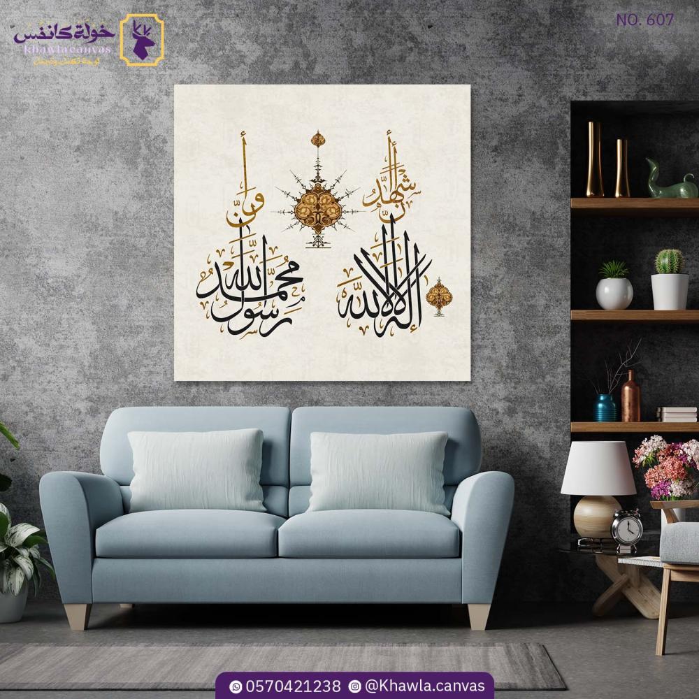 A wall plaque of the manuscript "I bear witness that there is no god but God and I bear witness that Muhammad is the Messenger of God", handwritten by the most skilled calligraphers with a luxurious design and a combination of black and gold colors and a sugar-colored background, printed on the finest types of canvas and stretched on a wooden frame, ready to hang.