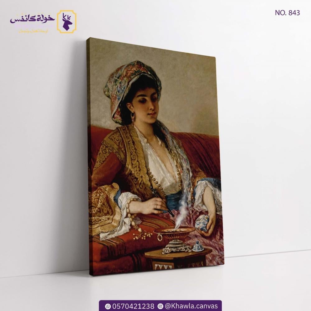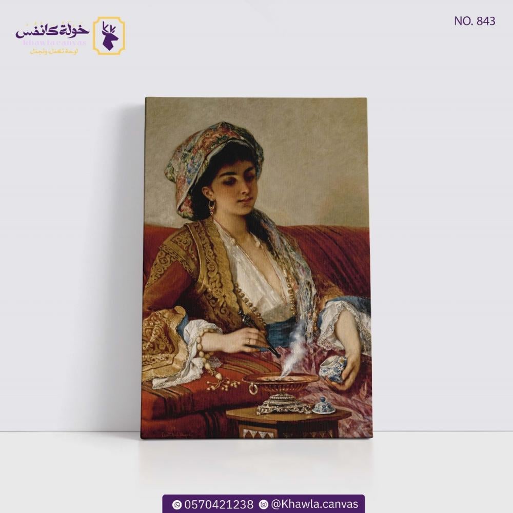 This painting depicts a young Ottoman woman, sitting quietly, gazing into the distance with a dreamy gaze. An atmosphere of stillness surrounds her, and she is surrounded by the rich oriental riches of her embroidered dress and gold jewelry.