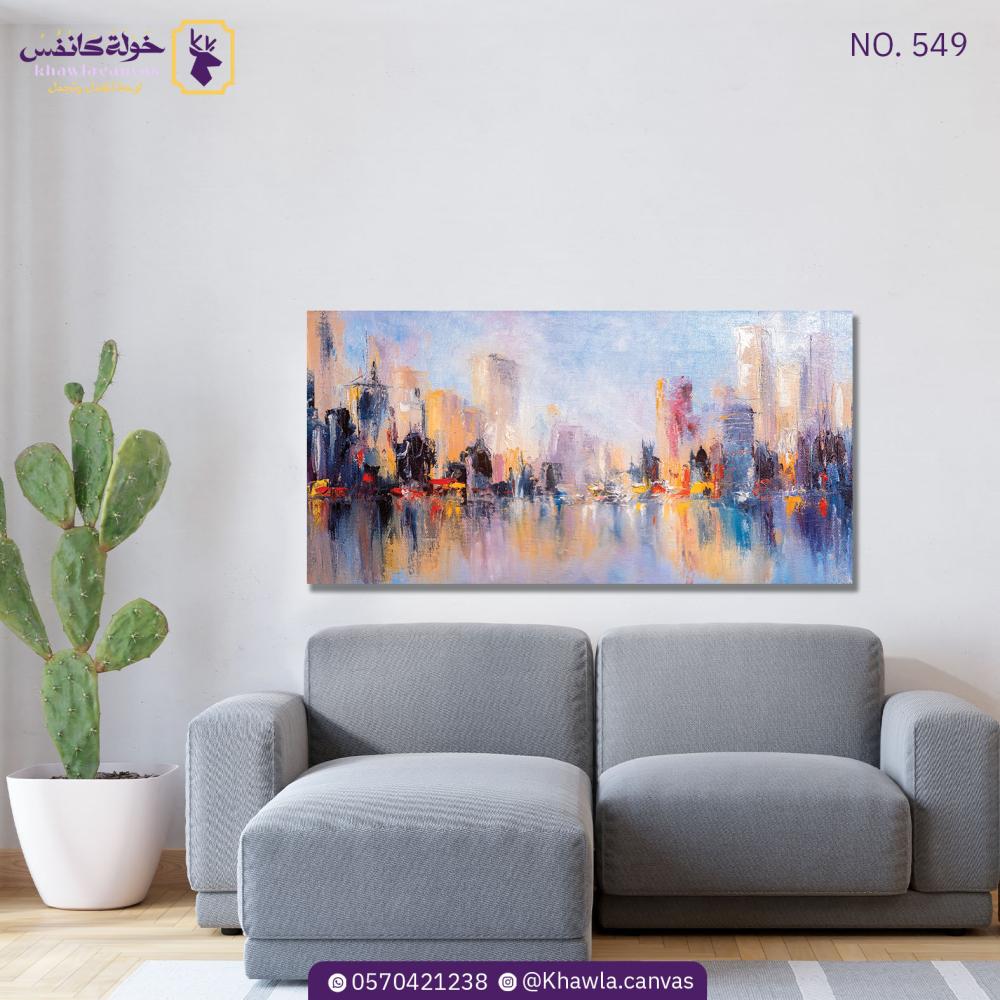 A painting of the city skyline with its reflection on the water, printed by the latest high-resolution Japanese machines (Roland) on canvas and stretched on a wooden frame.