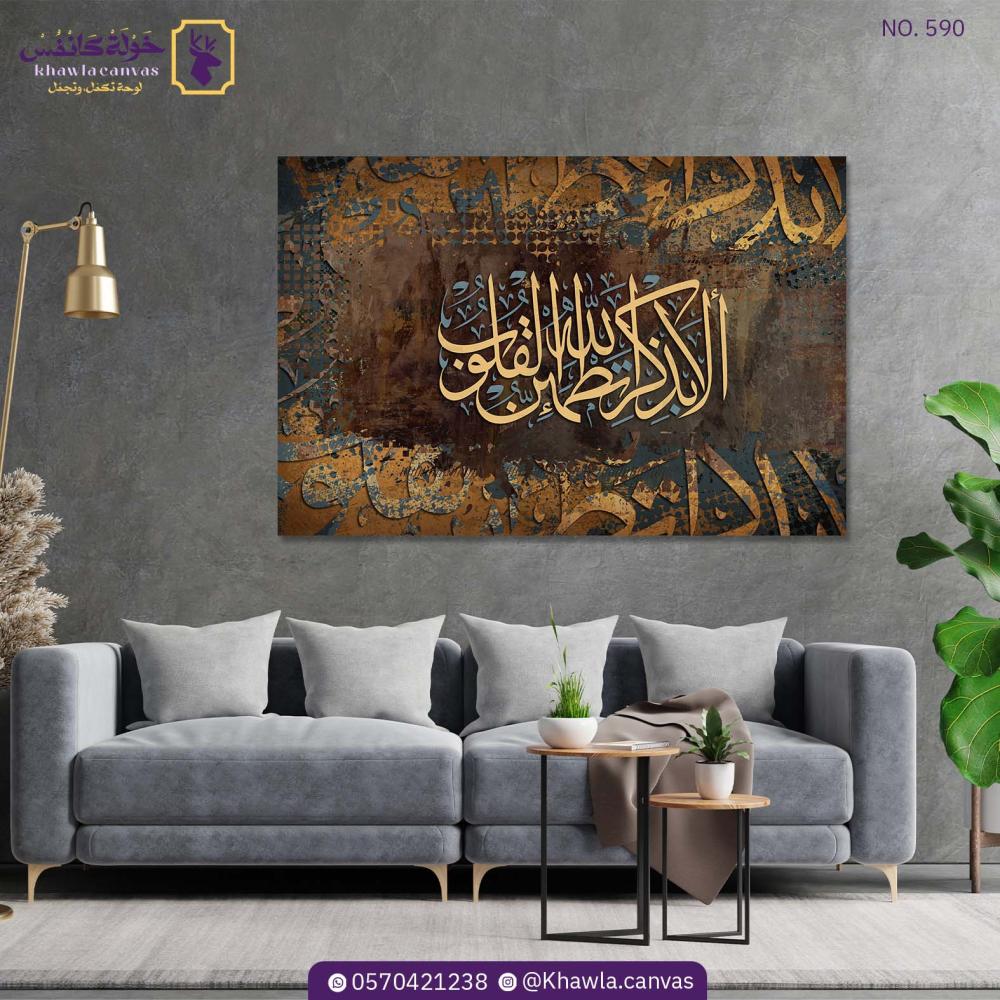 A wall painting of the manuscript "Do not remember God and hearts find rest", written by the most skilled calligraphers with a luxurious design and a mixture of brown and gold colors, printed on the finest types of canvas and stretched on a wooden frame, ready to hang.