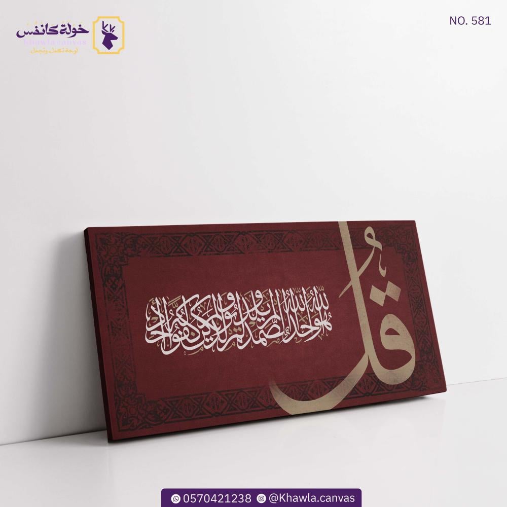 A Quranic manuscript of Surat Al-Ikhlas ((Say, “He is Allah, the One (1) Allah, the Eternal Refuge (2) He neither begets nor is born (3) And there is none comparable to Him (4)))) by the most skilled calligraphers in a luxurious design in maroon, printed on the finest canvas and stretched on a wooden frame, ready to hang.