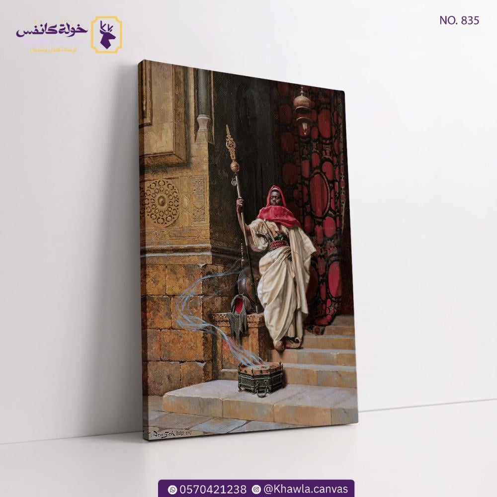His features reflect both austerity and calm, while the architectural background, rich in Islamic engravings, adds grandeur and symbolic power to the painting.