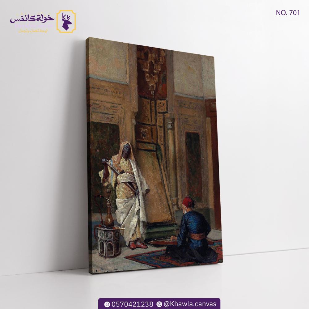 The painting depicts an interior scene rich in oriental details, showing a musician sitting and playing a traditional instrument, while a uniformed guard stands quietly watching him.