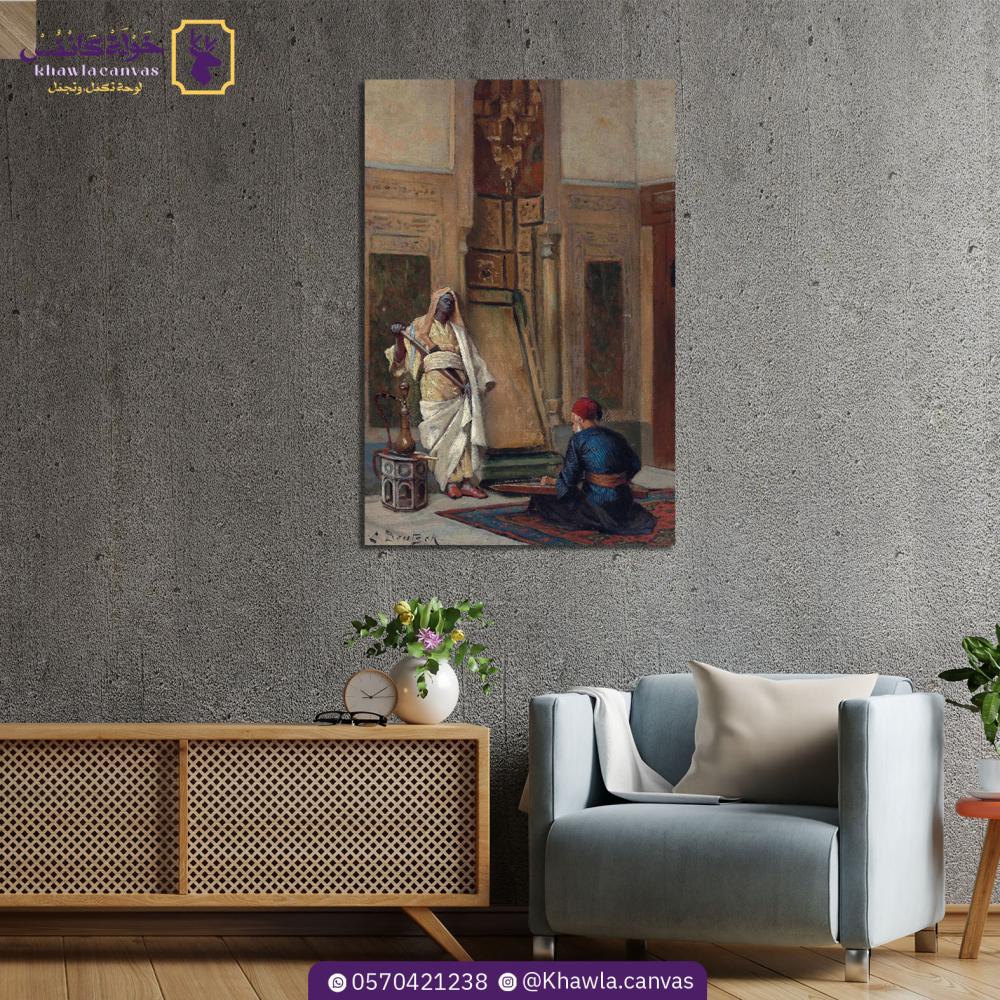 The backdrop is decorated with Islamic tiled walls, luxurious oriental carpets, and architectural details that suggest the opulence of the place.