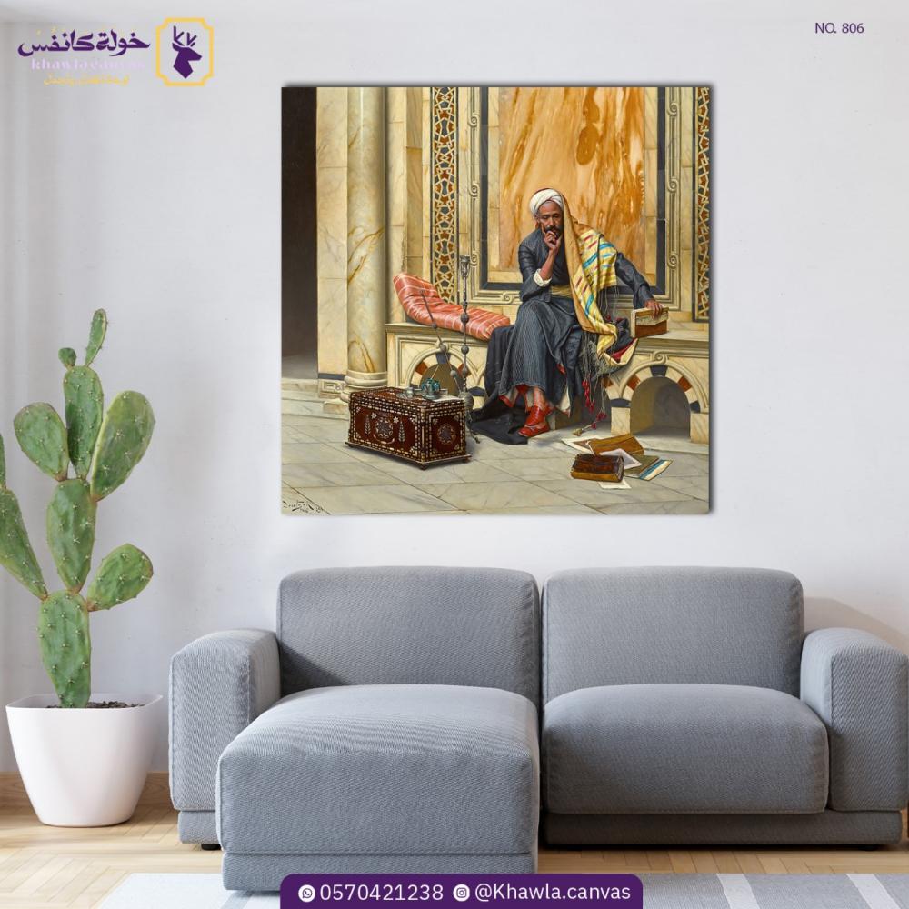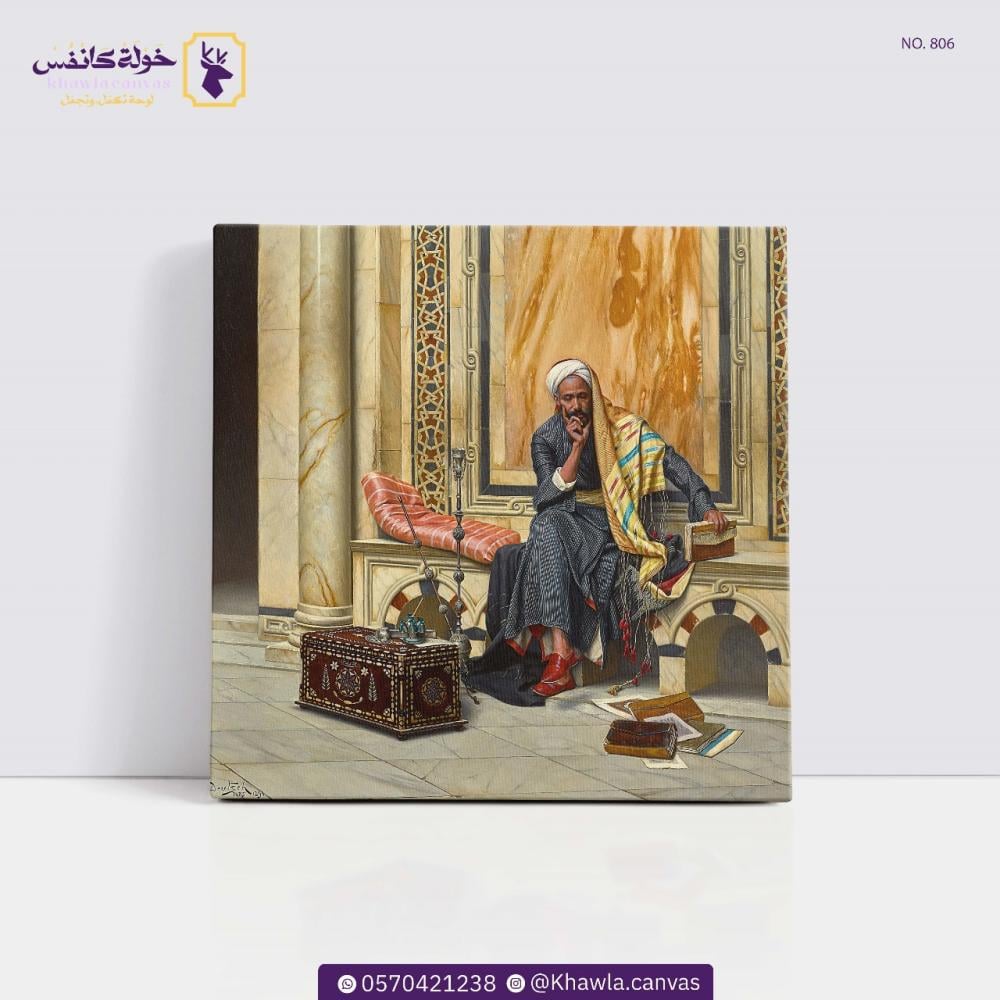 In this stunning painting, Austrian artist Ludwig Deutsch depicts a Muslim scribe seated in a lavish oriental architectural niche, surrounded by marble columns and richly detailed Islamic decorations. The scribe appears deep in contemplation, holding an ancient book in one hand and leaning on a stone shelf with the other. Books and manuscripts are scattered around him, along with a luxurious ivory-inlaid chest and traditional inkwells, lending the scene a profound sense of heritage and majesty.